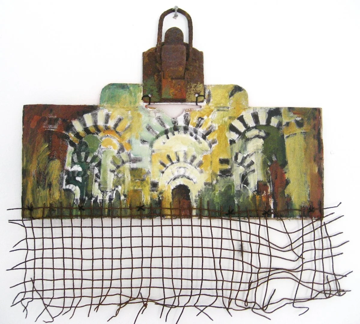 Wander through a junk shop, garage sale, or flea market - create some 3D assemblages from other people’s refuse. Collect things in nature or on the street. Bits of rusty metal or natural objects like leaves. Explore ways to use them. The piece below was created using various found objects including a piece of a cardboard box as the base.