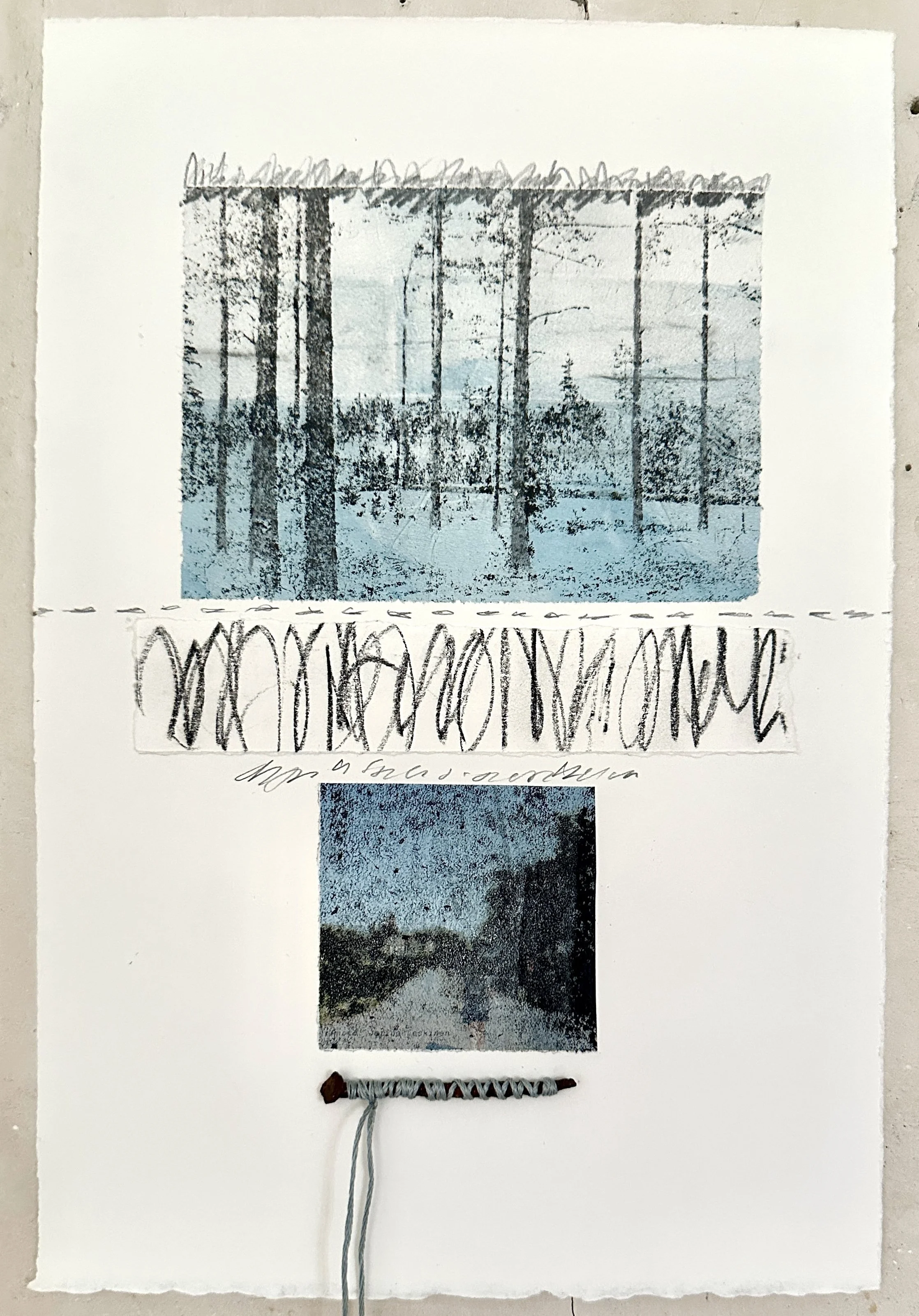 Try Silence #5 ©Amy Guion Clay 2025 Collaged hand painted papers, old nail and thread.