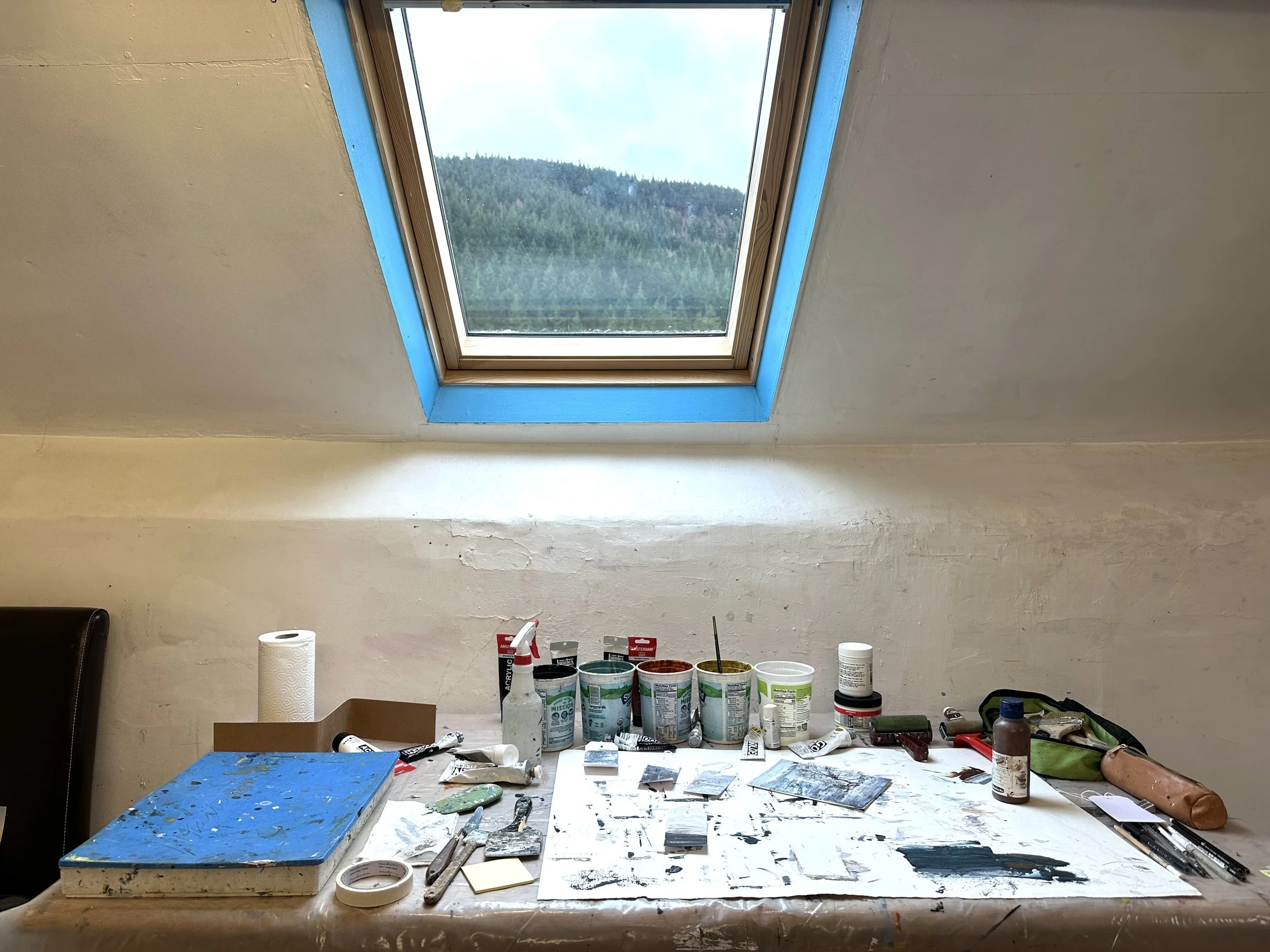 My painting table in the attic studio at Stiwdio Maelor, with a view out to the nearby forested hills. ©Amy Guion Clay 2026